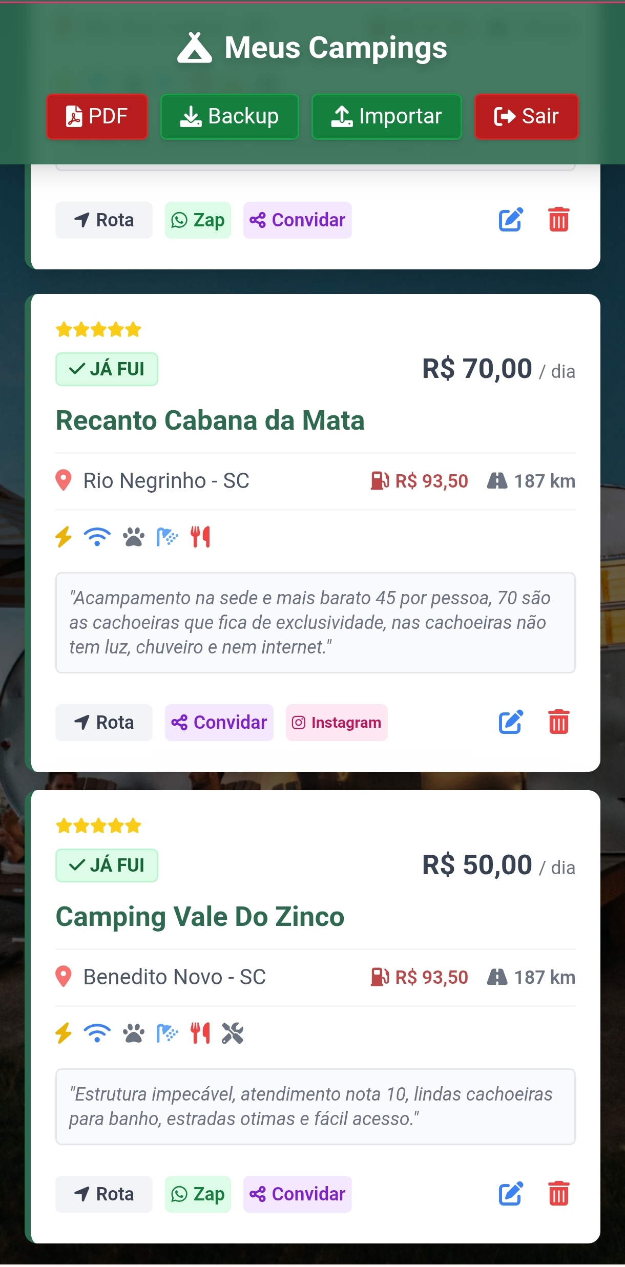 Salve cidade, WhatsApp, estrutura, localização, diária e fotos de cada camping visitado.